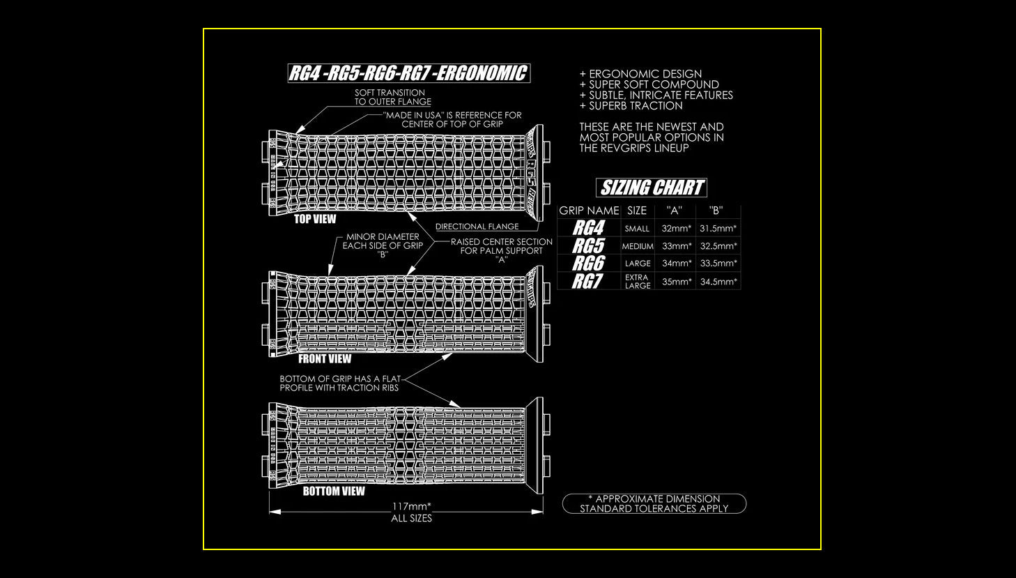 Choose from 4 distinct sizes of Ergonomic Shaped grips from an RG4 to an RG7. These all have a VERY subtle, ergonomic design that supports your hand where it's needed.  We've incorporated traction ribs on the bottom of the grip for the ultimate in performance and comfort.  All 4 of these sizes have the same design/profile.  Simply choose your size (thickness). All sizes utilize our Super Soft compound designed for the ultimate in traction and performance.